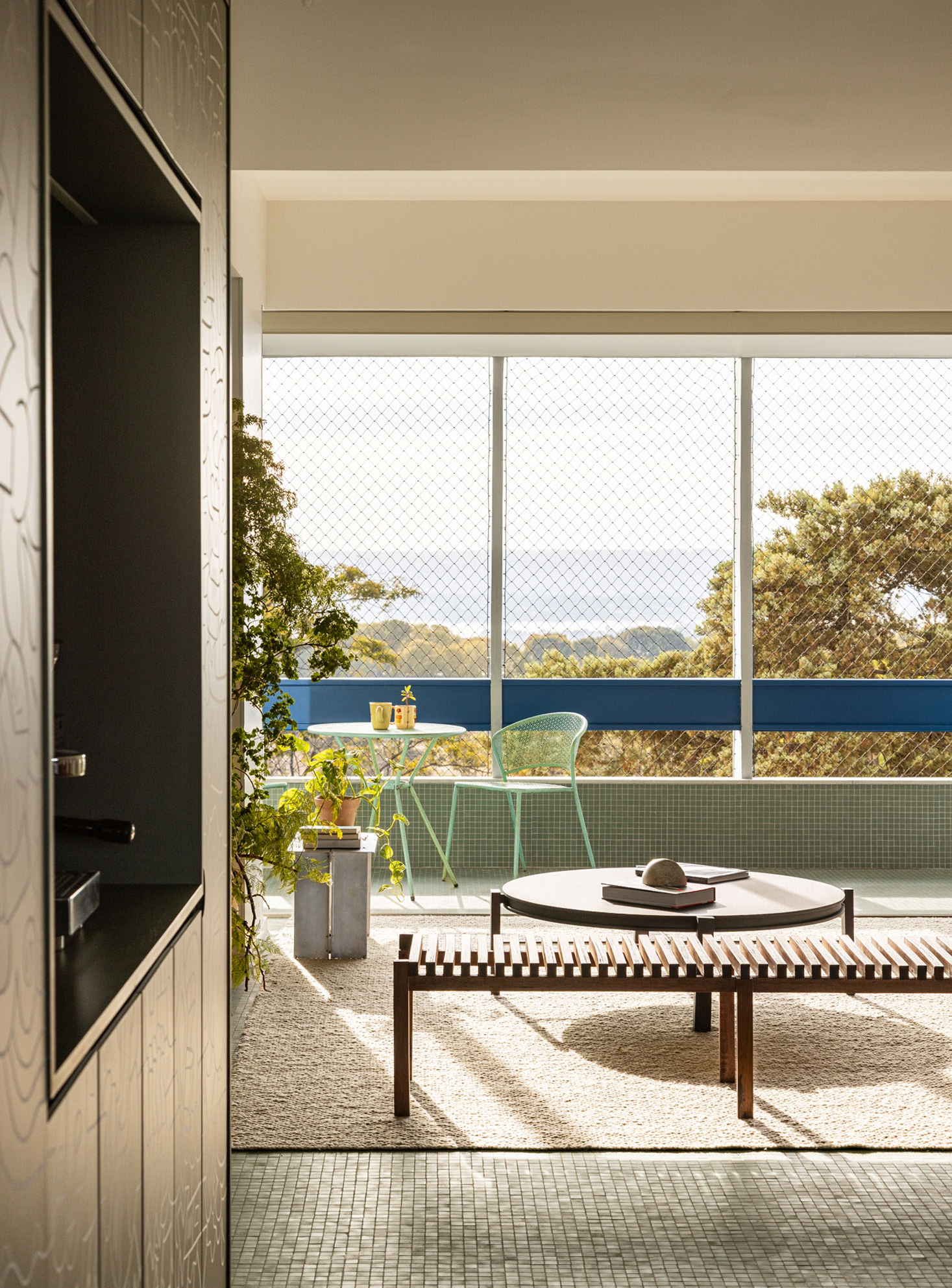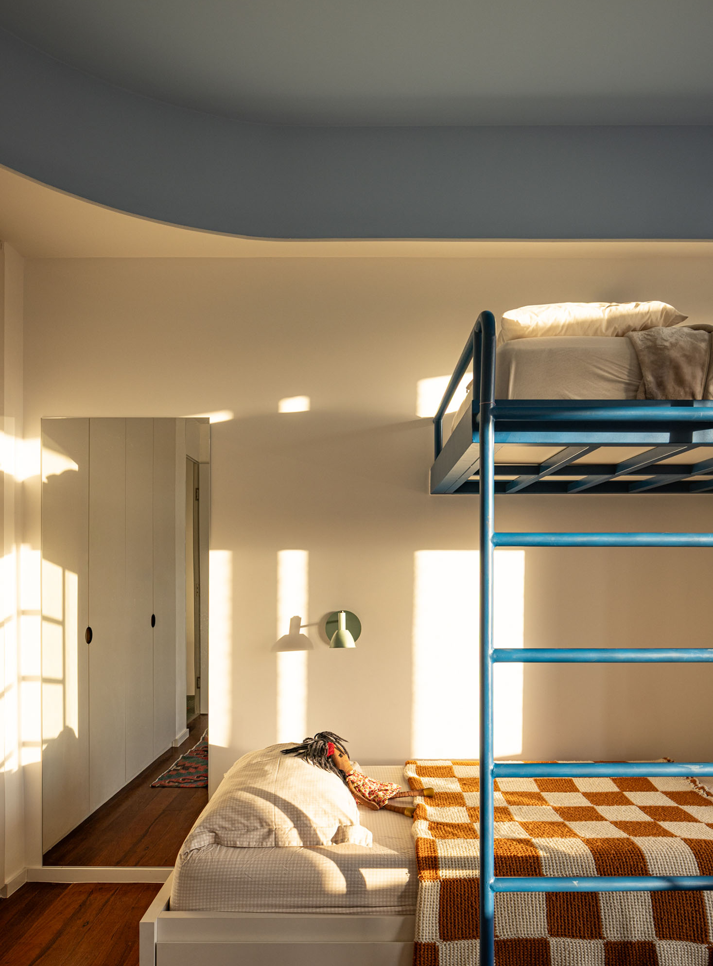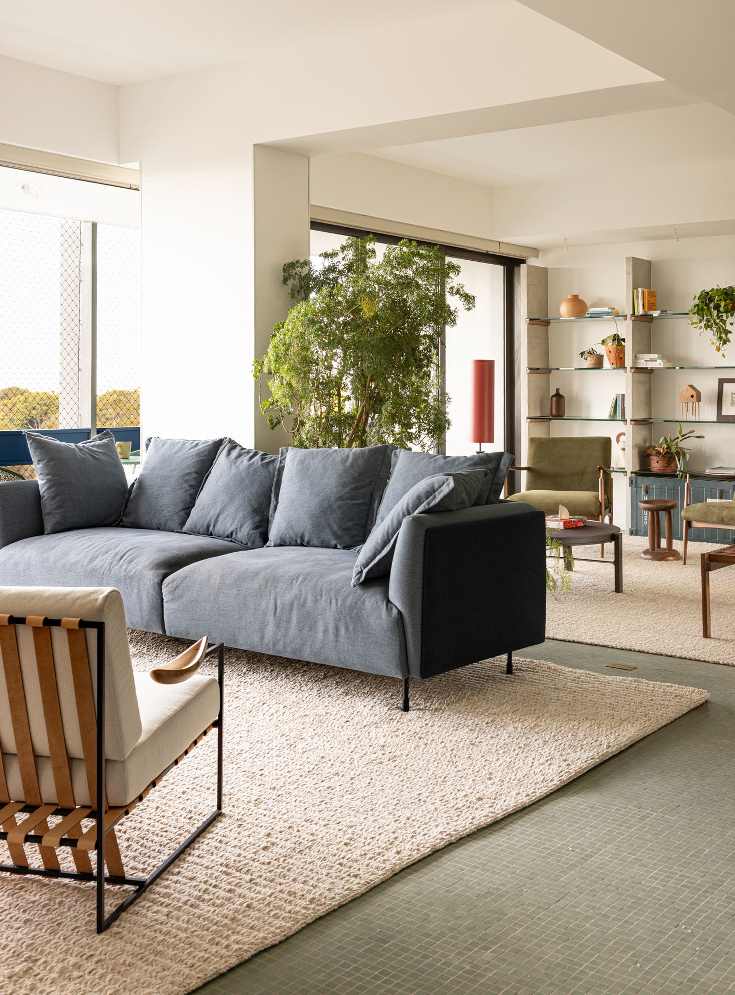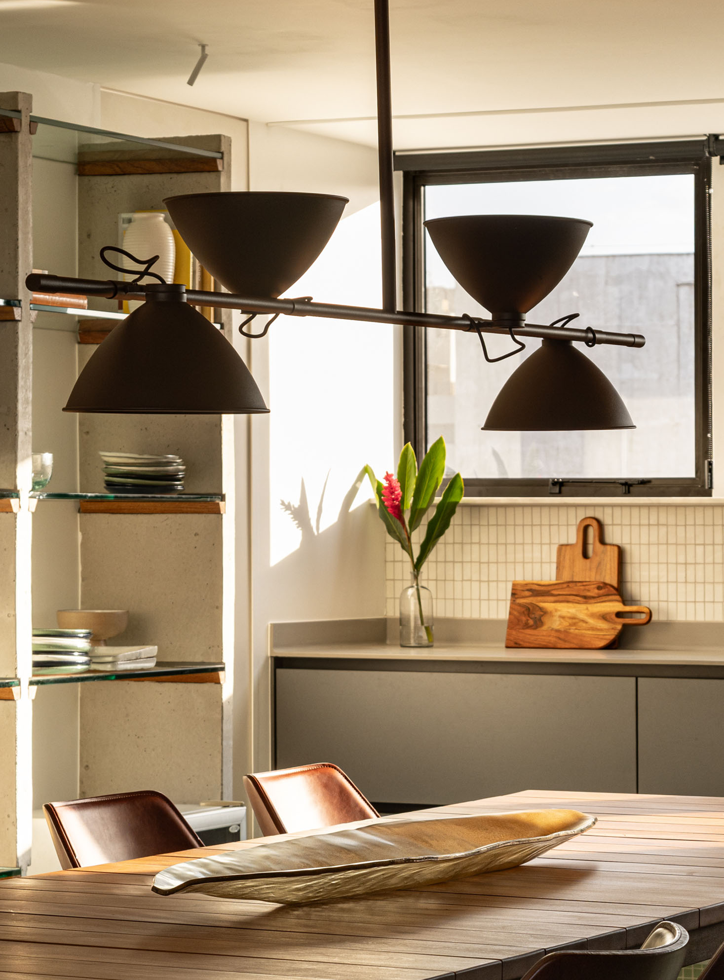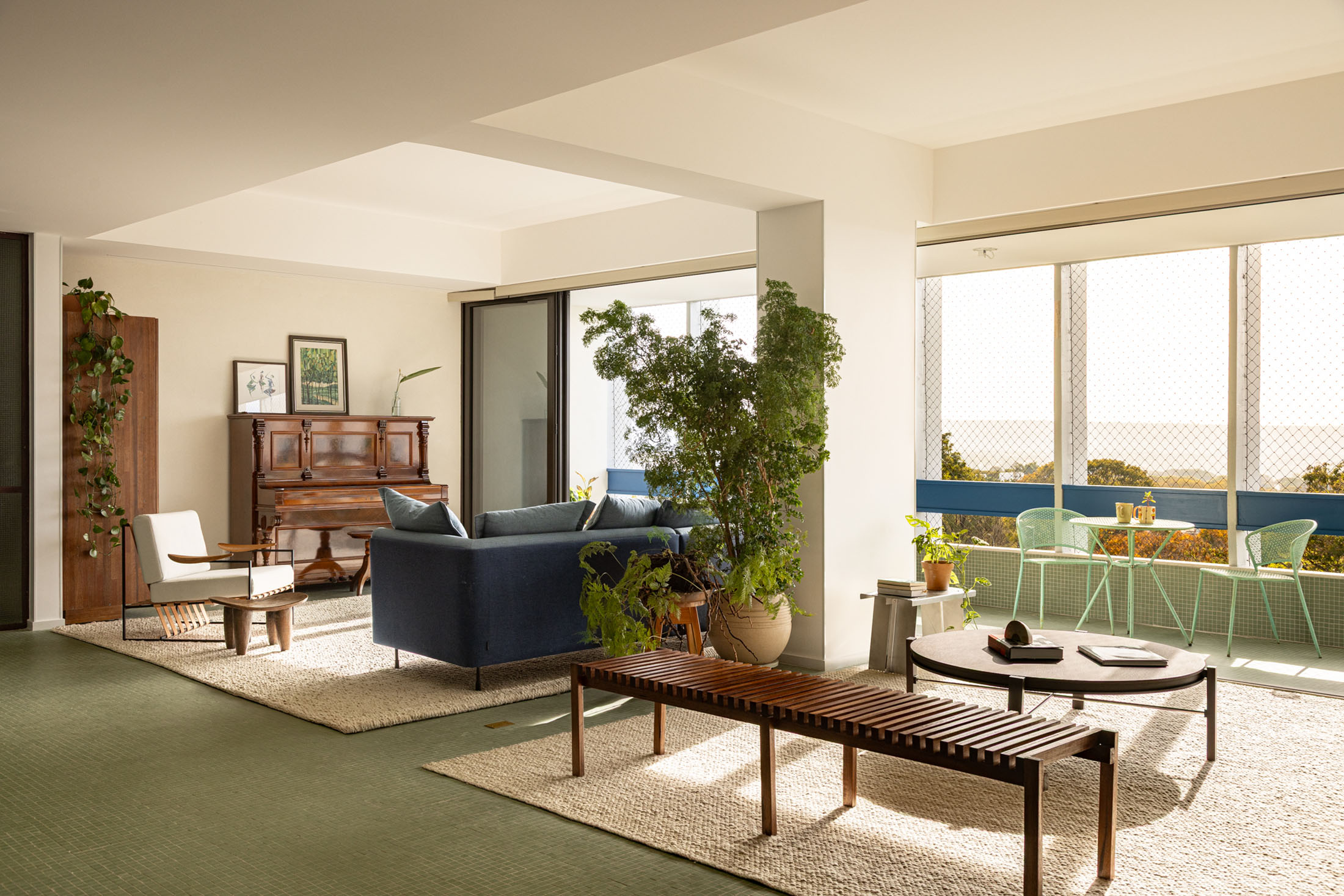 A intervenção teve início com a recuperação da varanda original, voltada para o nascente, transformando-a em uma extensão da área social. No lado poente, a cozinha foi deslocada para o local onde ficavam as dependências e lavanderia e aberta para a sala. O resultado é um ambiente vazado e multifuncional, avarandado em toda sua extensão. O gesto espacial de integração dos espaços também responde ao desejo dos proprietários — um casal paulista com filhos — de habitar um lar amplo, iluminado e ventilado, que favorecesse a convivência diária e o acolhimento de familiares e amigos.