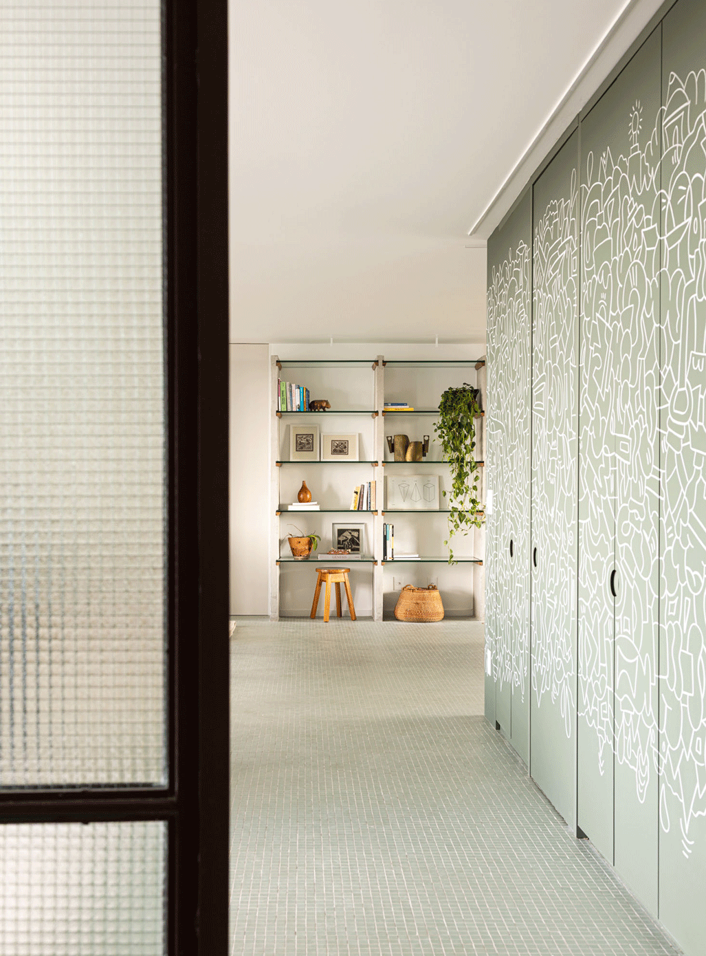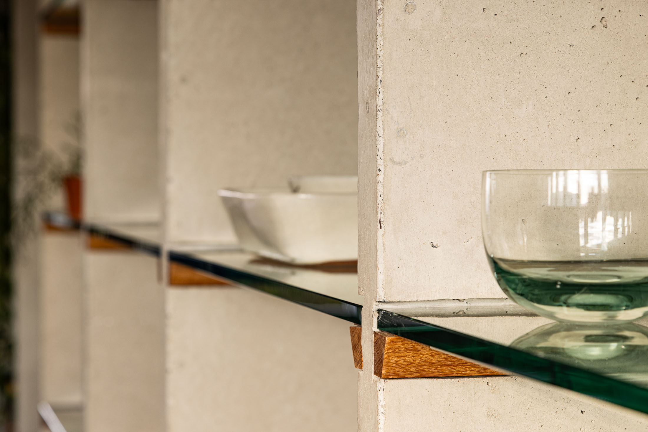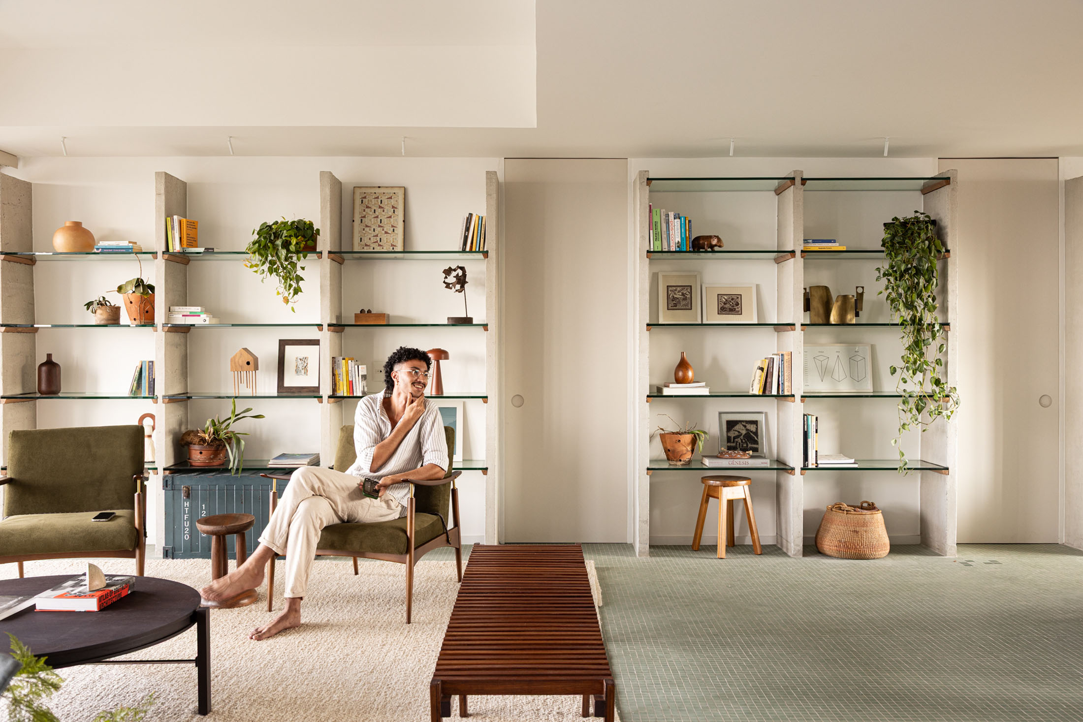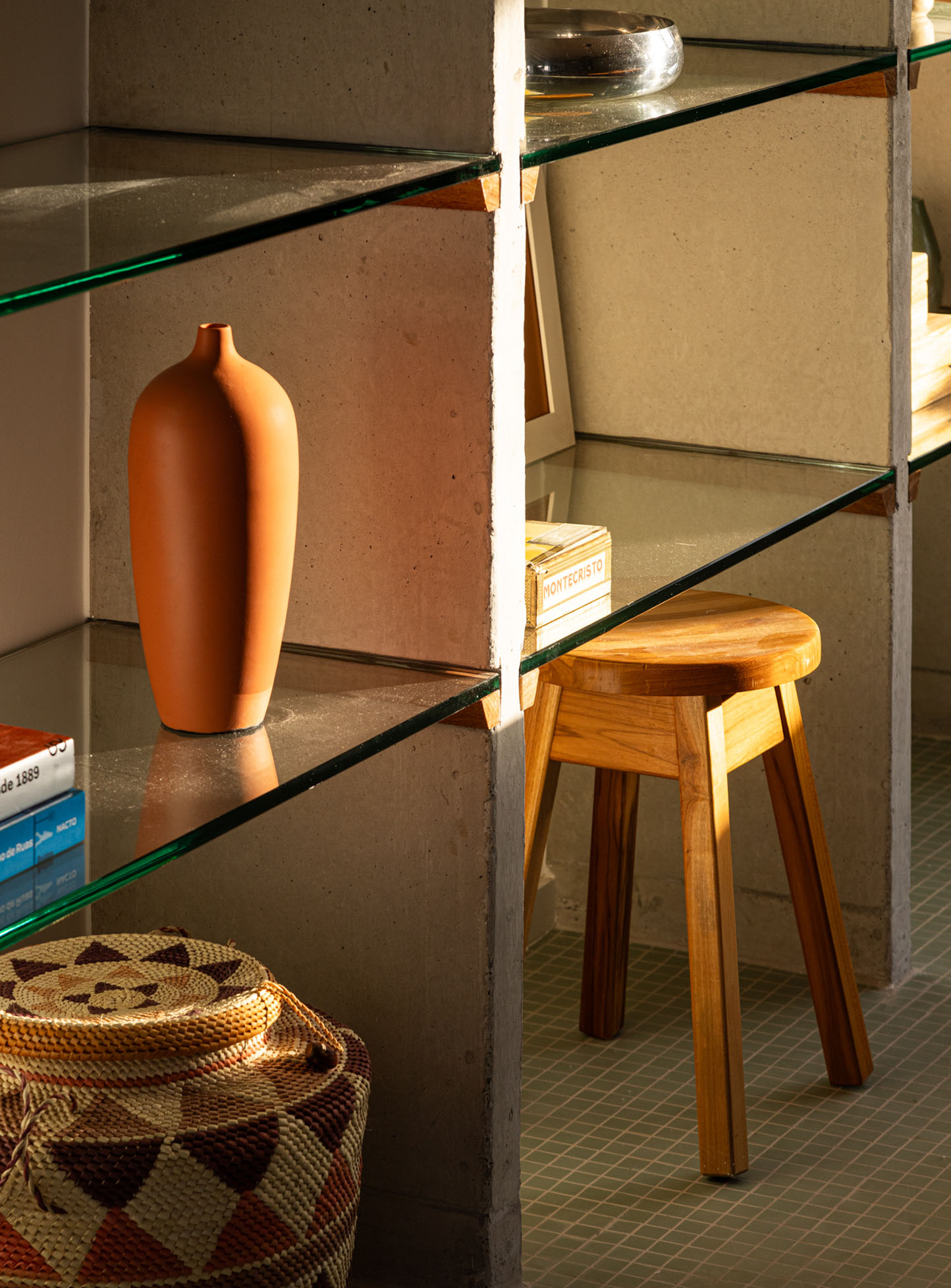 Na transição entre a parte íntima e social, uma ampla estante foi construída em concreto espelhando o ritmo dos elementos da fachada do edifício. Para reforçar a verticalidade da proposta, as prateleiras foram feitas em vidro temperado, suportadas por cunhas de madeira desenhadas na obra.