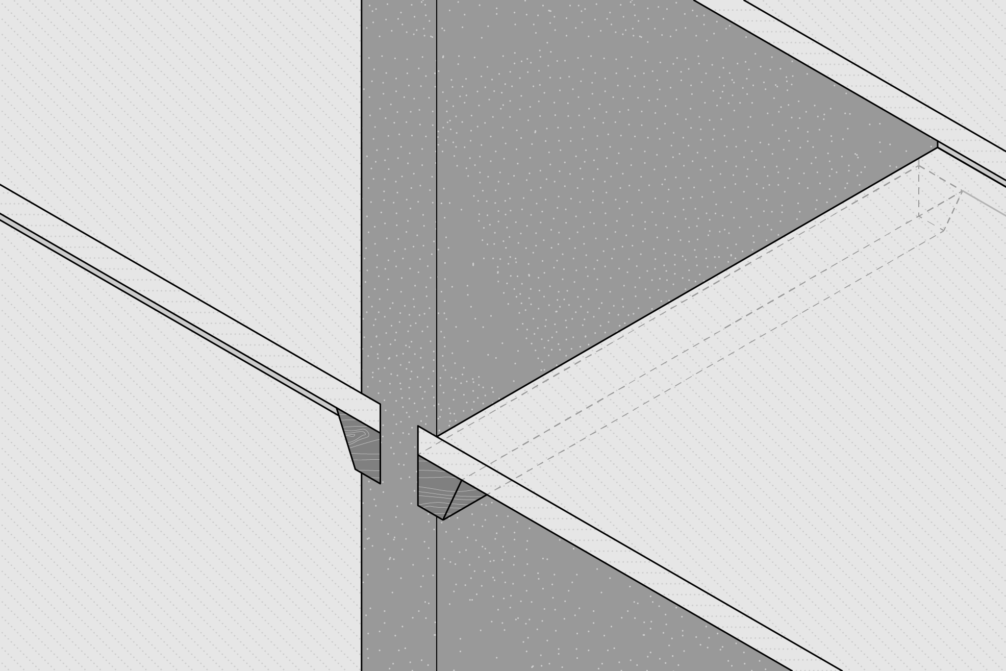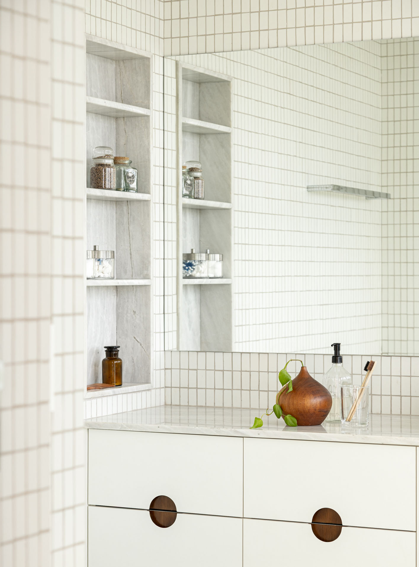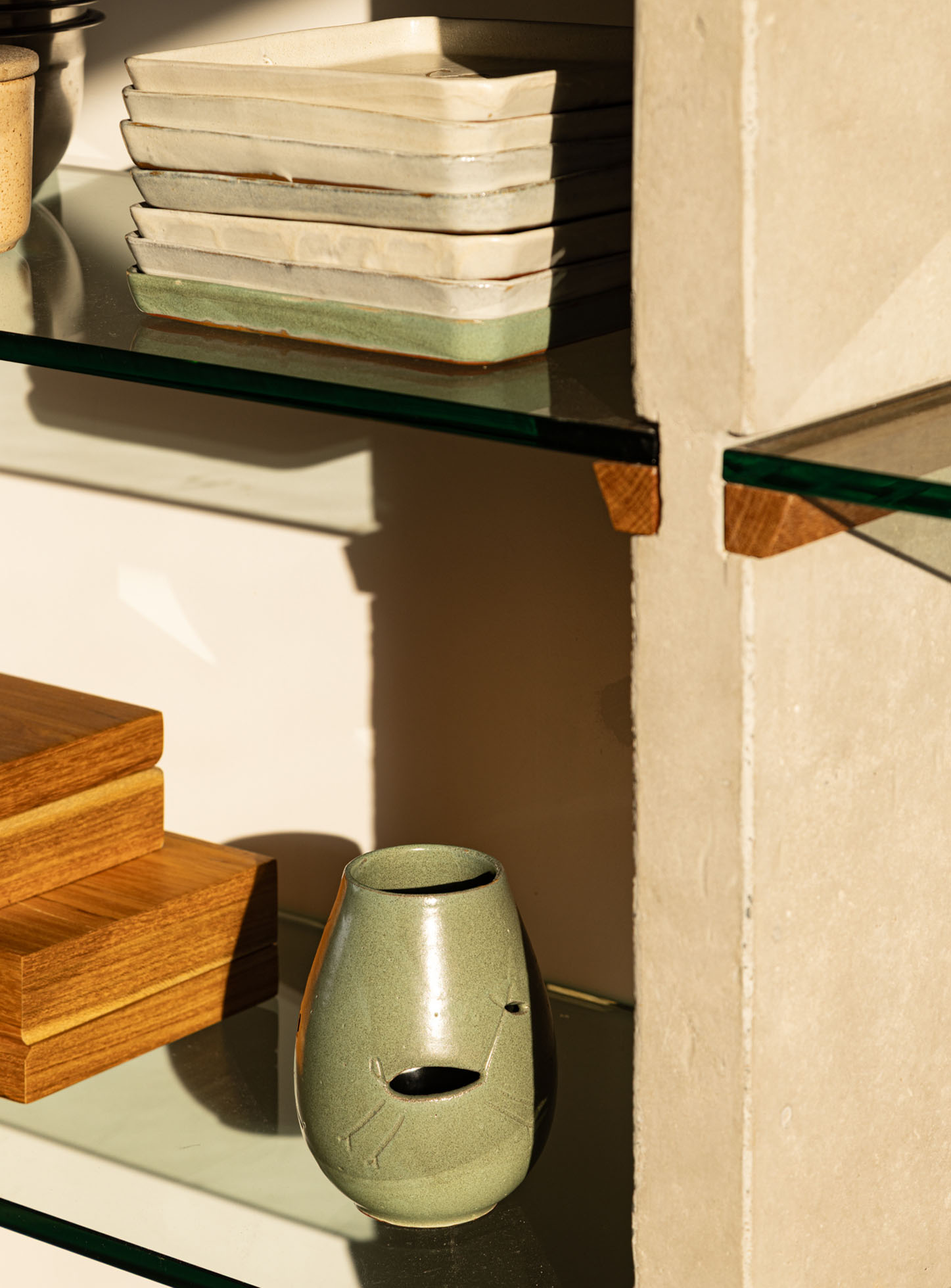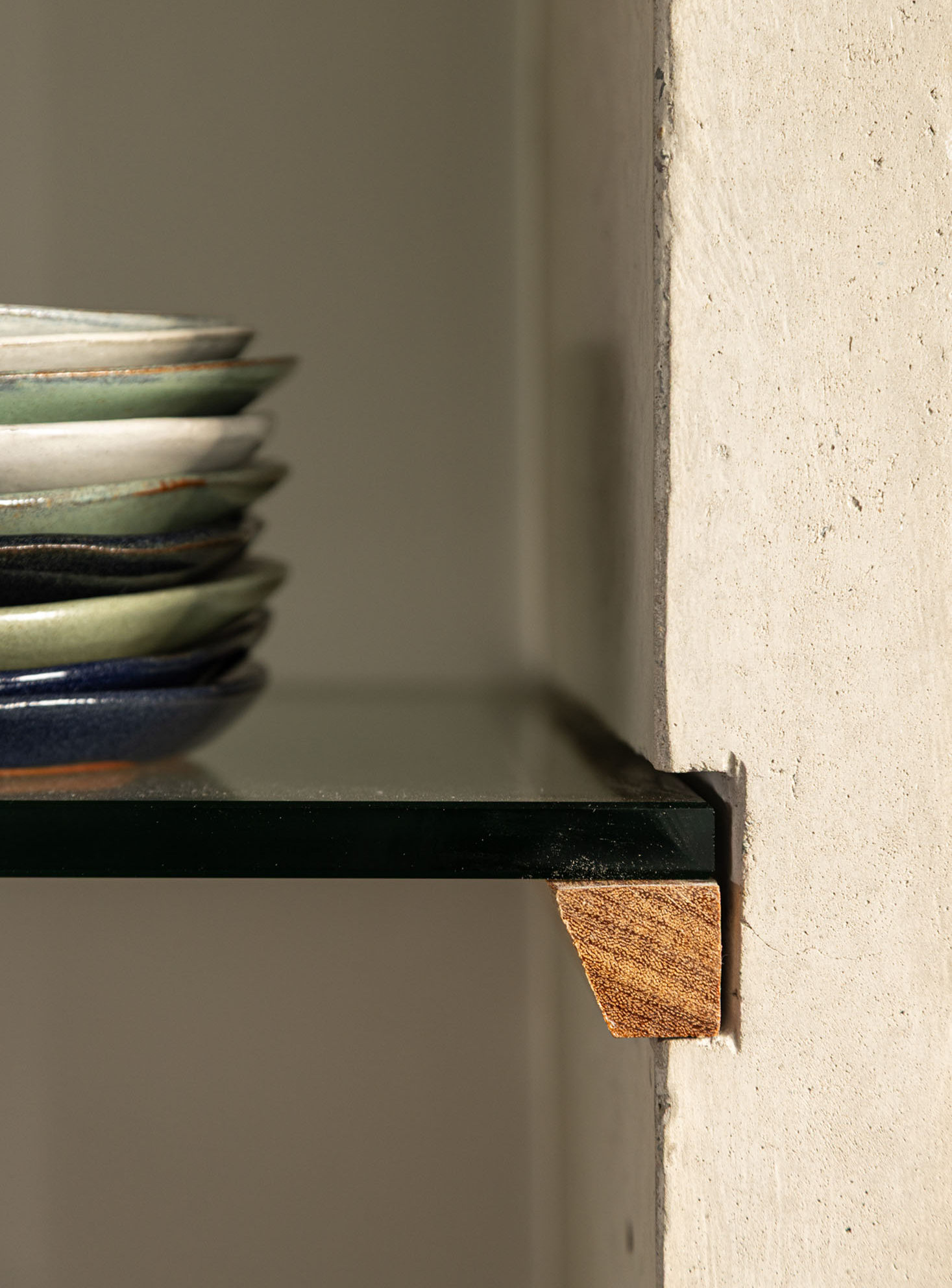 Na transição entre a parte íntima e social, uma ampla estante foi construída em concreto espelhando o ritmo dos elementos da fachada do edifício. Para reforçar a verticalidade da proposta, as prateleiras foram feitas em vidro temperado, suportadas por cunhas de madeira desenhadas na obra.