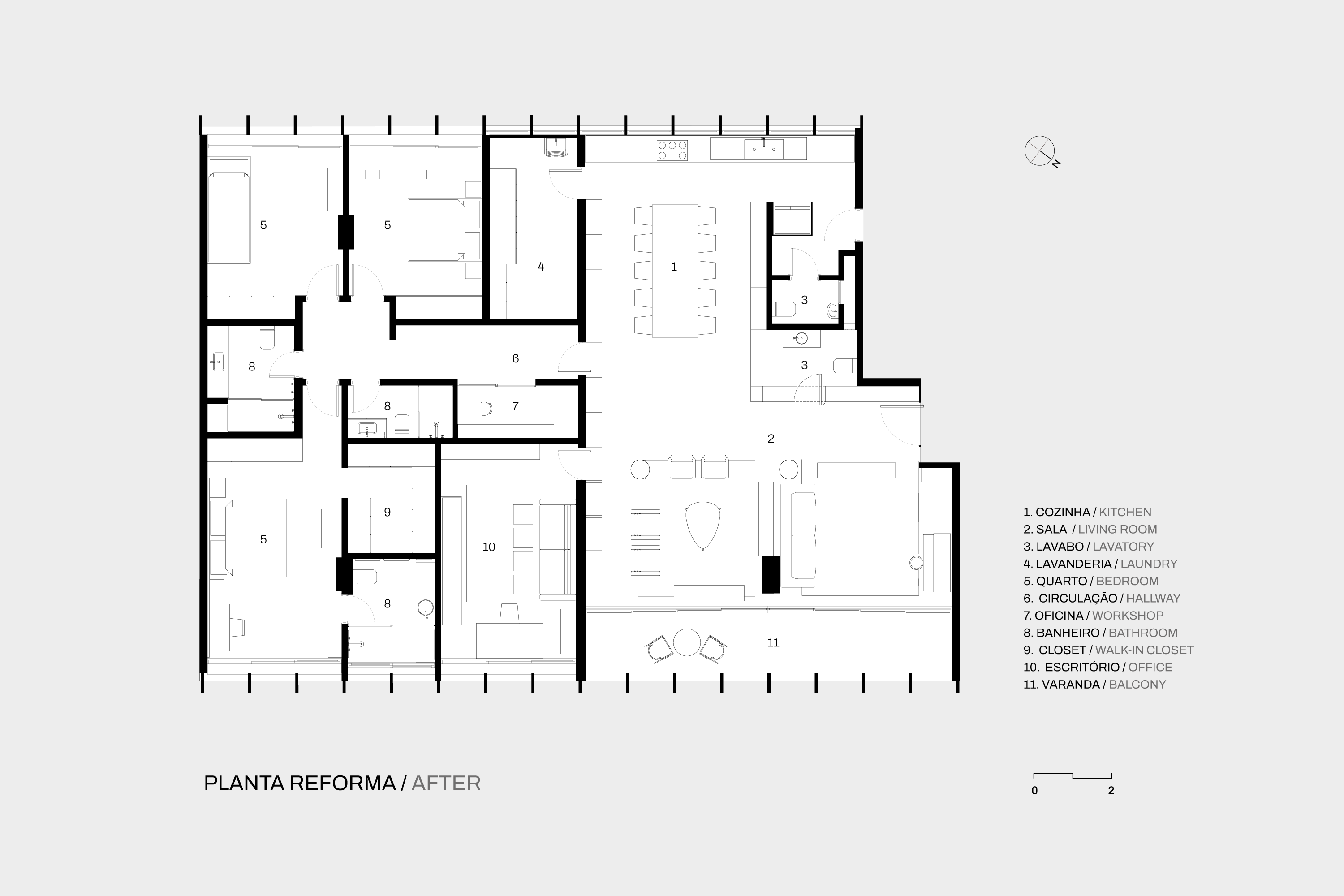 Sem necessidade de intervenções estruturais, o projeto transforma uma planta rígida em um espaço coeso, funcional e permeado por referências modernistas reinterpretadas sob uma perspectiva contemporânea e afetiva.