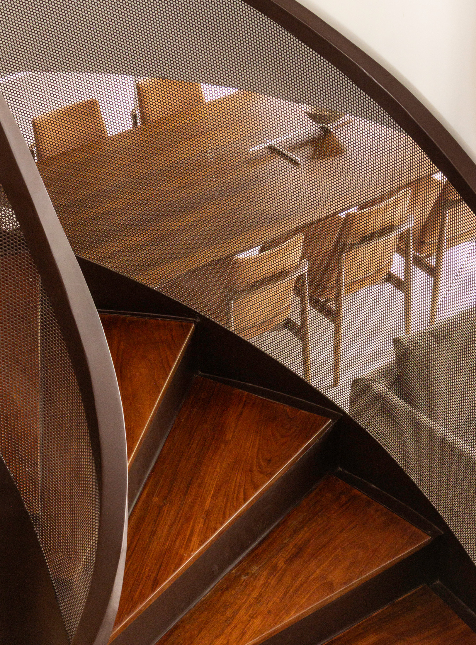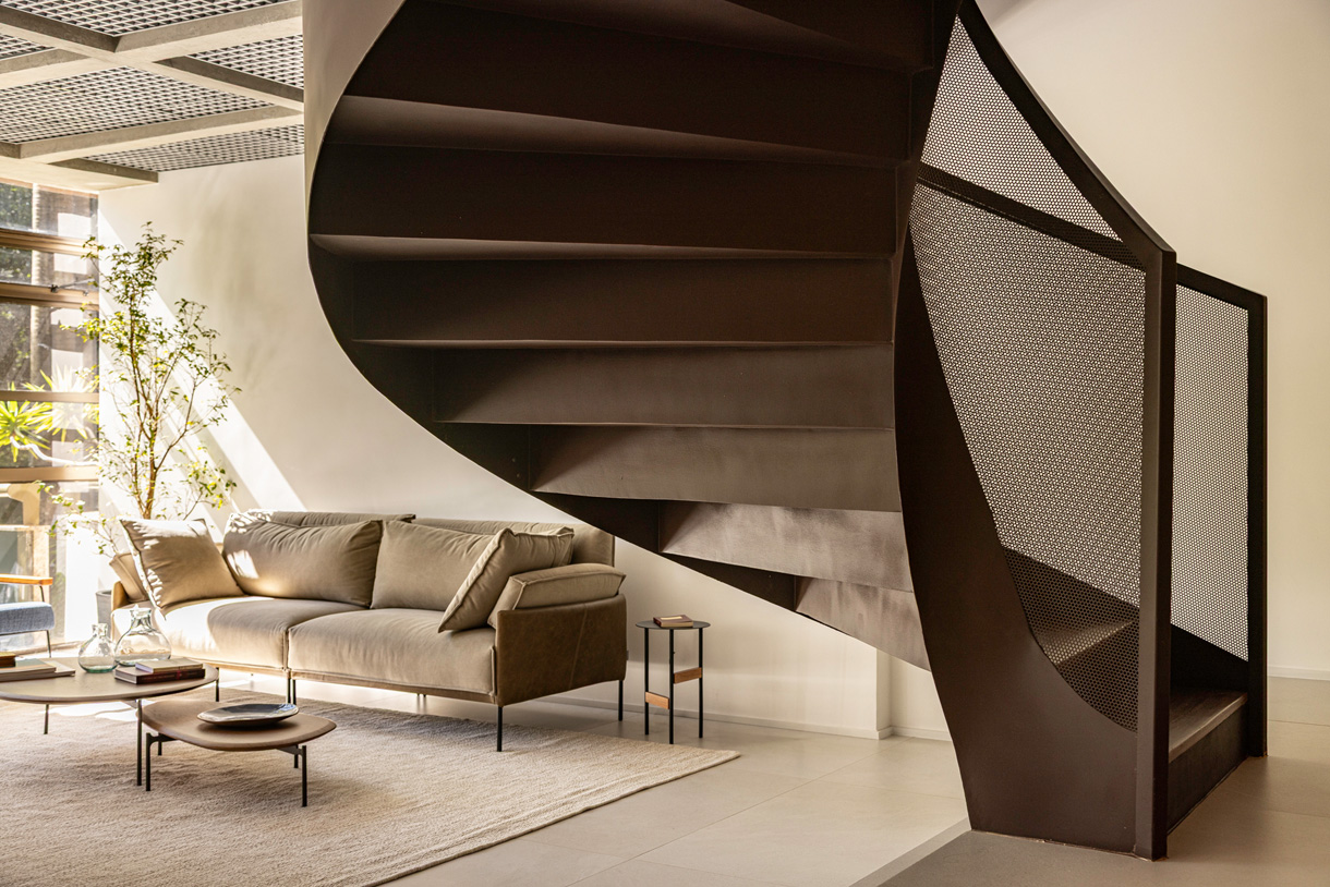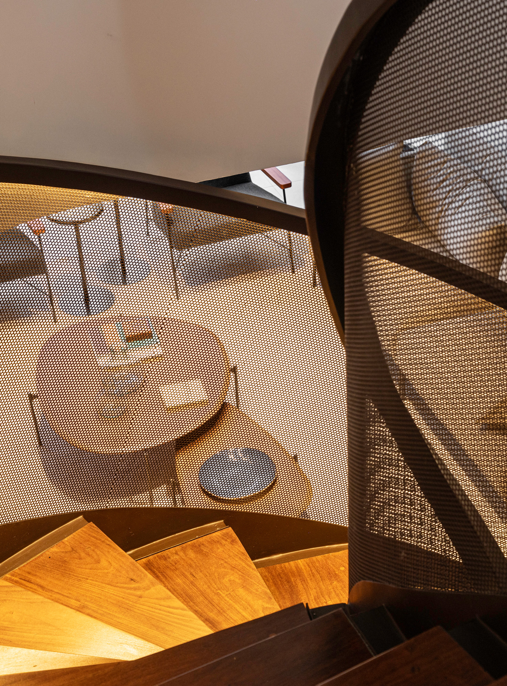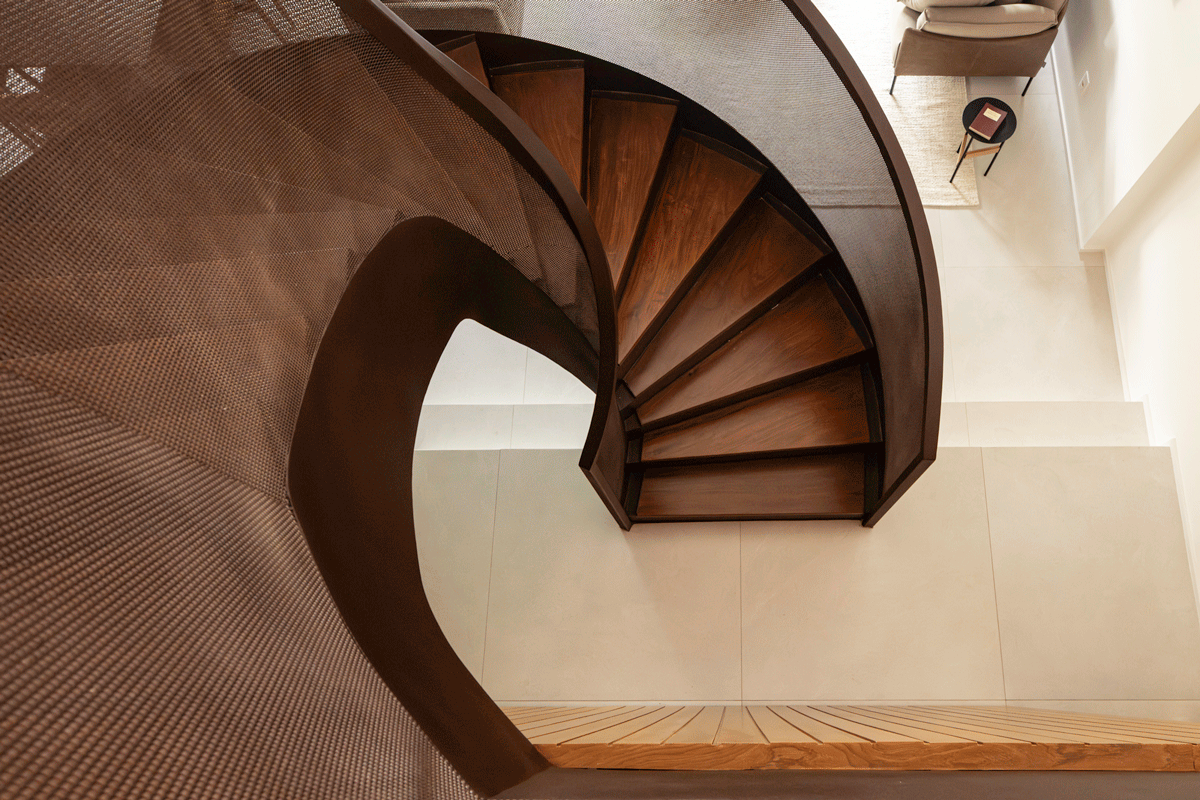 A justaposição das malhas metálicas que formam o guarda-corpo da escada cria o efeito Moiré, que dá o nome ao projeto.