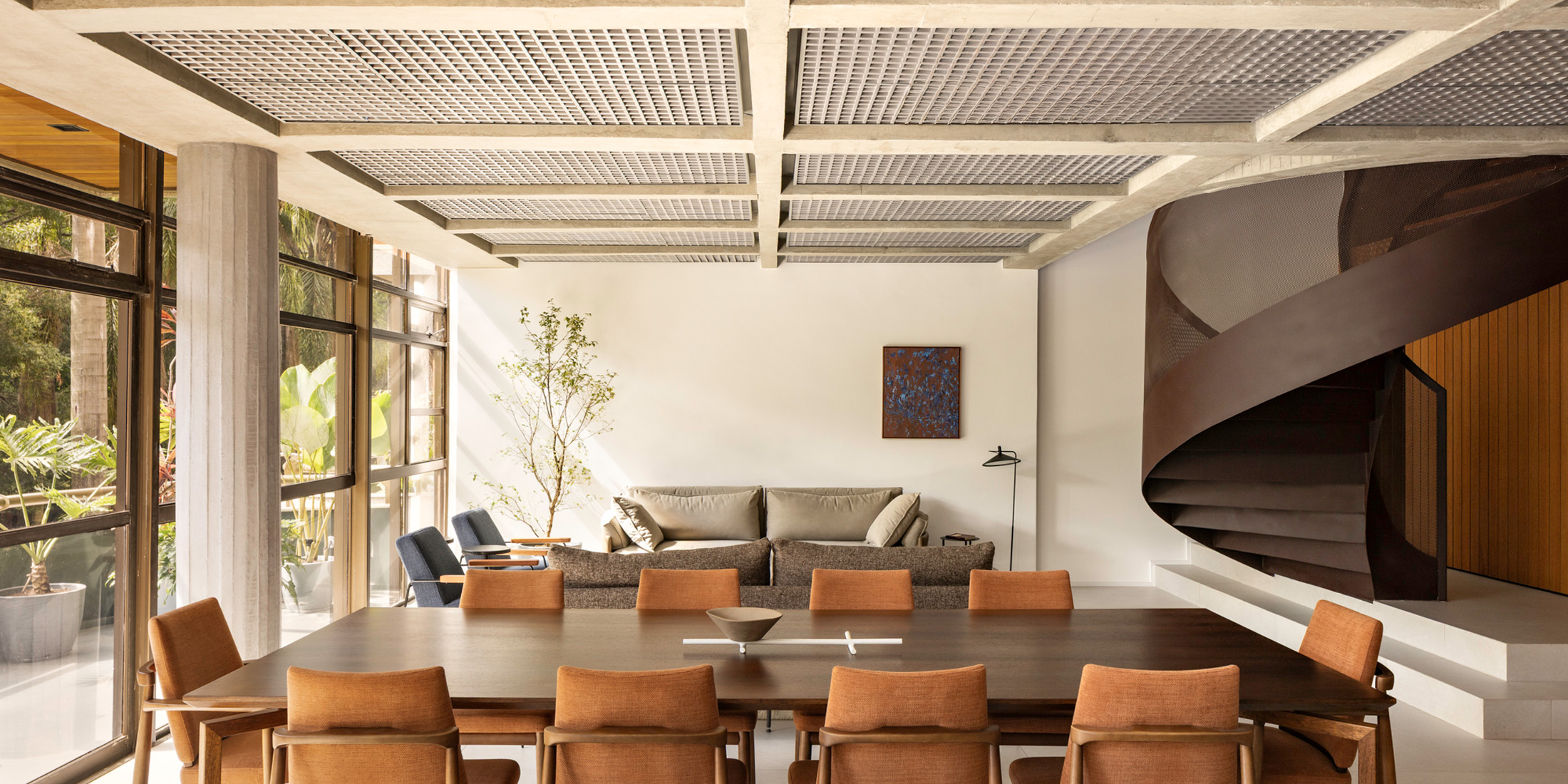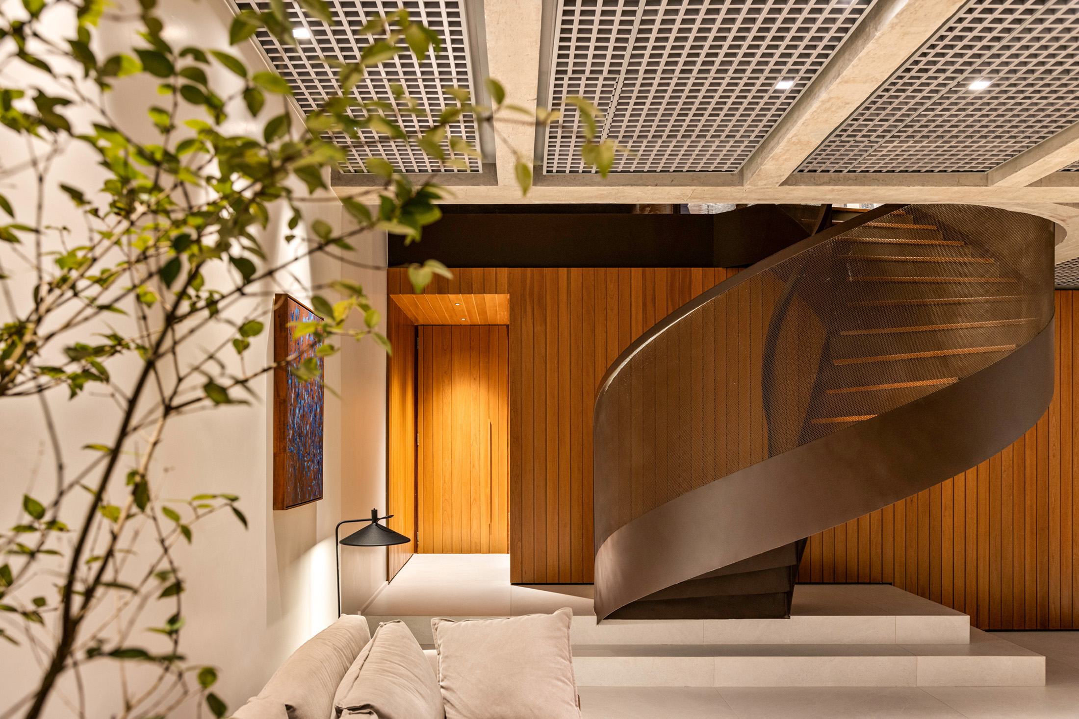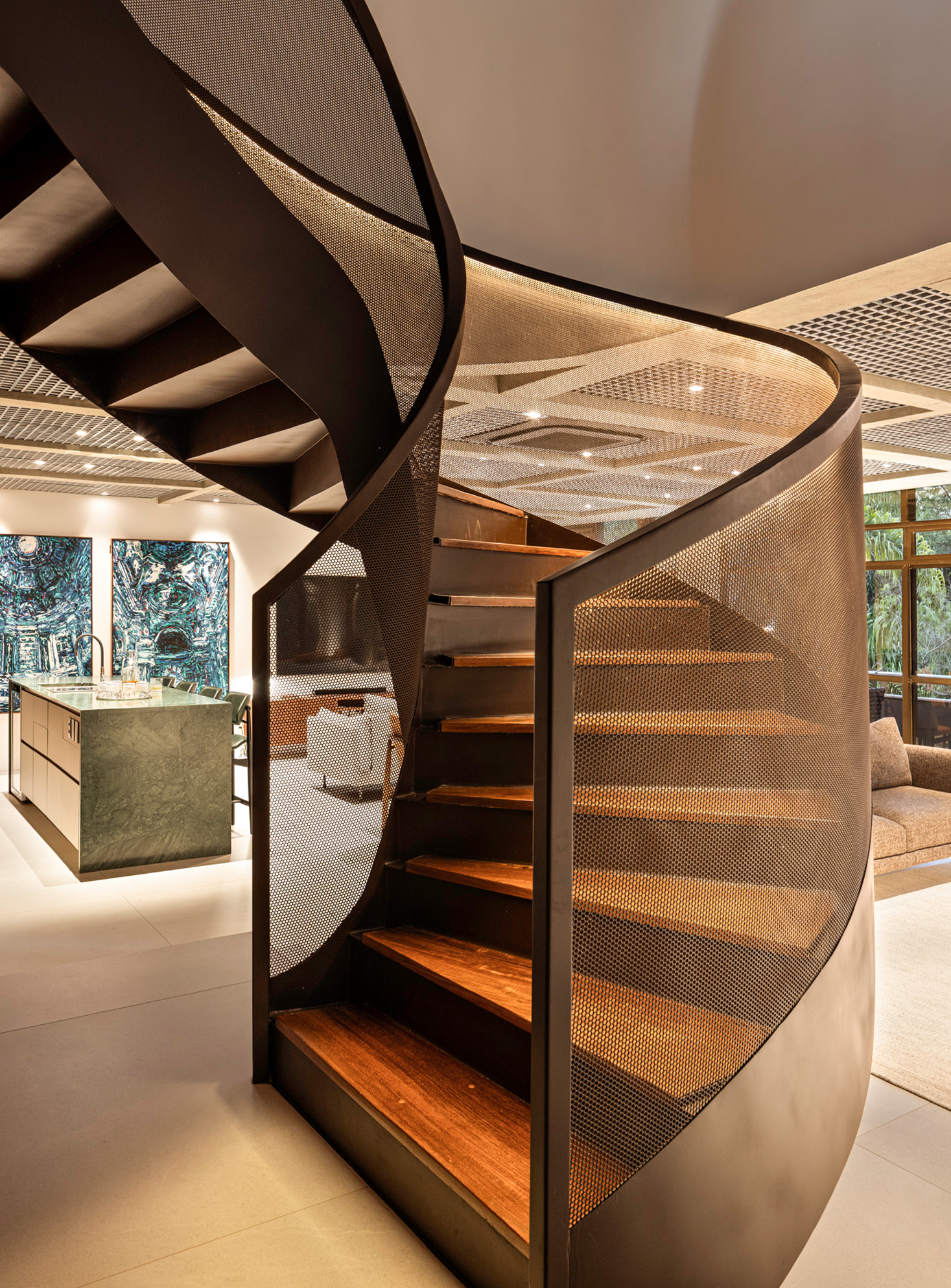 A justaposição das malhas metálicas que formam o guarda-corpo da escada cria o efeito Moiré, que dá o nome ao projeto.