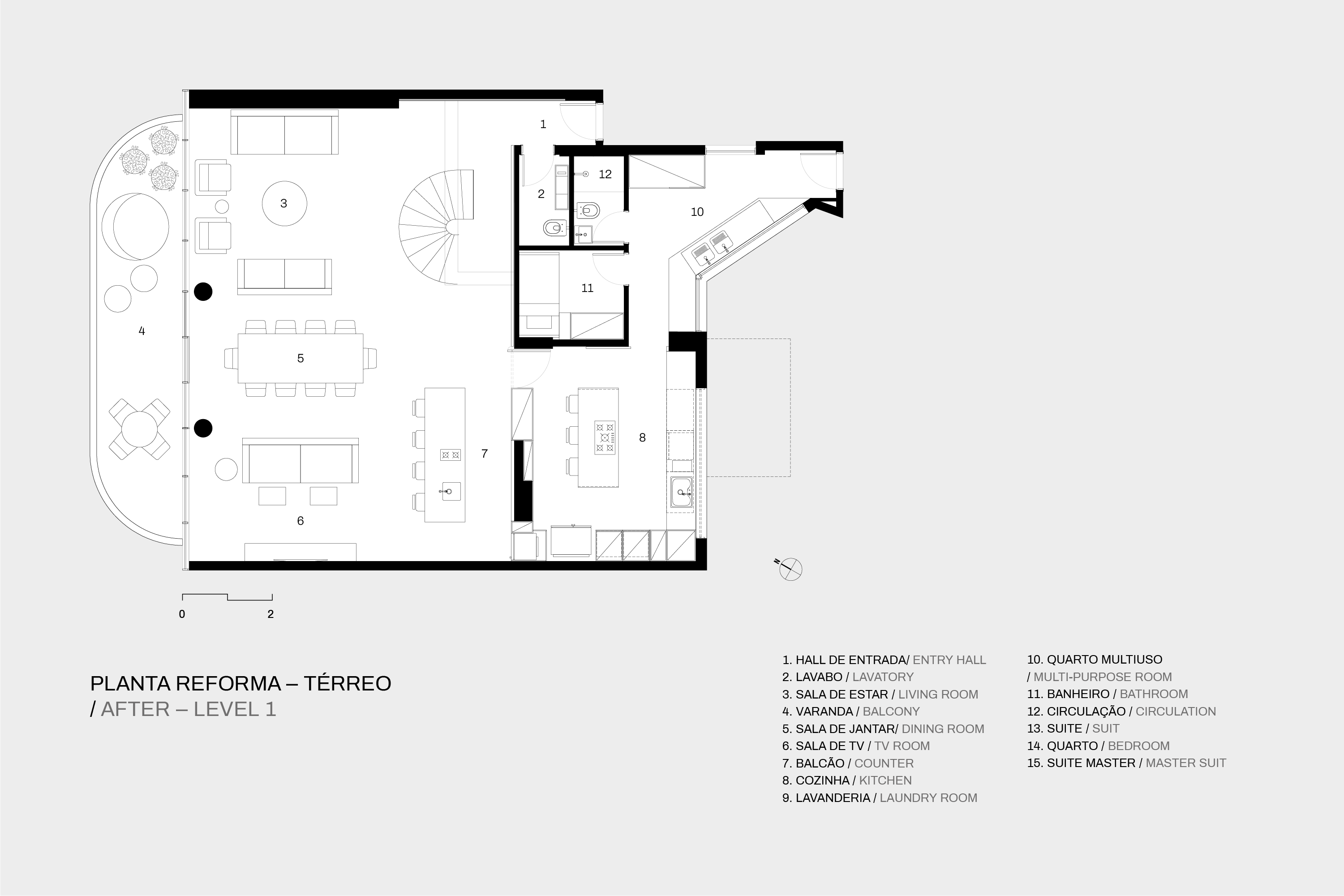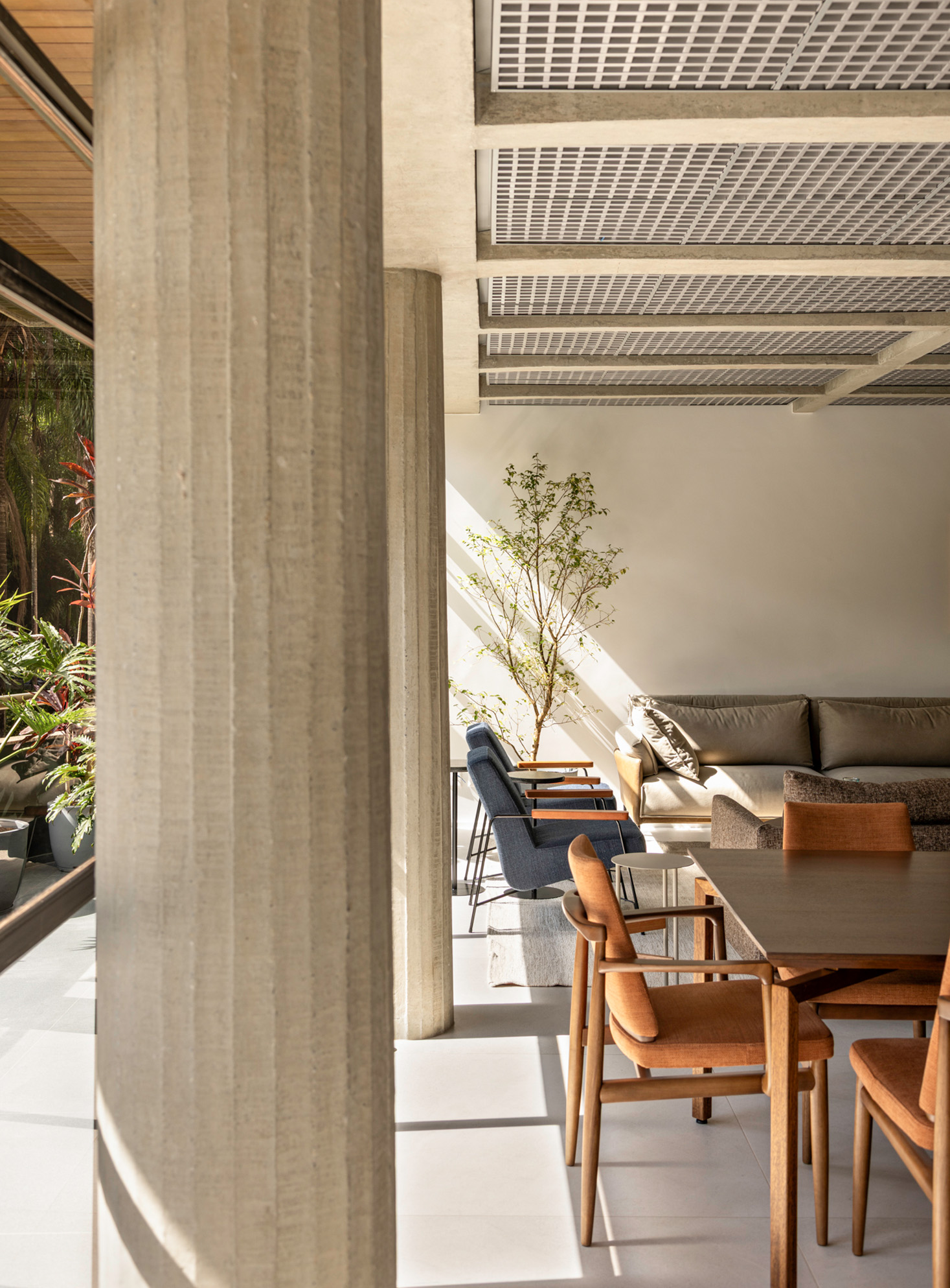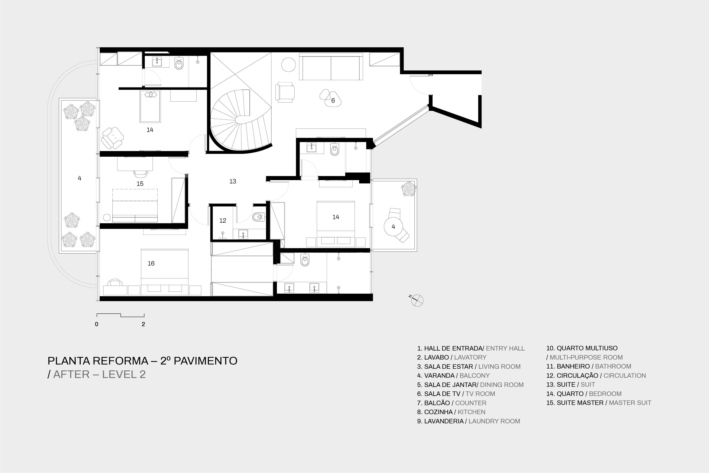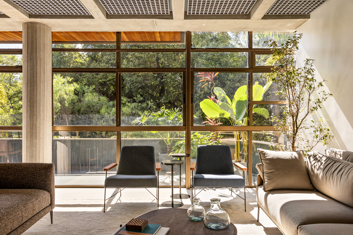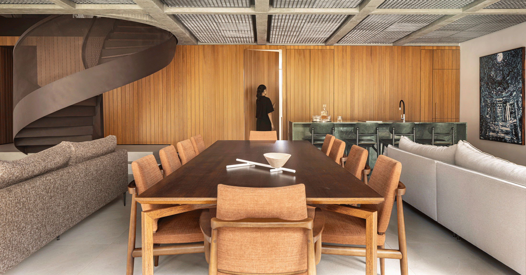 Localizado em um dos primeiros blocos duplex das superquadras de Brasília, o apartamento de 294 metros quadrados passou por uma reforma que transformou completamente sua configuração e atmosfera. O projeto buscou valorizar a essência do edifício, deixando vigas e pilares em concreto aparente, evidenciando a materialidade da estrutura. Ao mesmo tempo, integrou espaços e proporcionou uma vivência fluida conforme o dia a dia contemporâneo. A escada teve sua estrutura original preservada mas ganhou novo guarda-corpo e corrimão metálico, tornando-se um elemento central que marca a identidade do projeto. A sobreposição das malhas metálicas que formam o guarda-corpo da escada cria o efeito Moiré, que dá o nome ao projeto.
