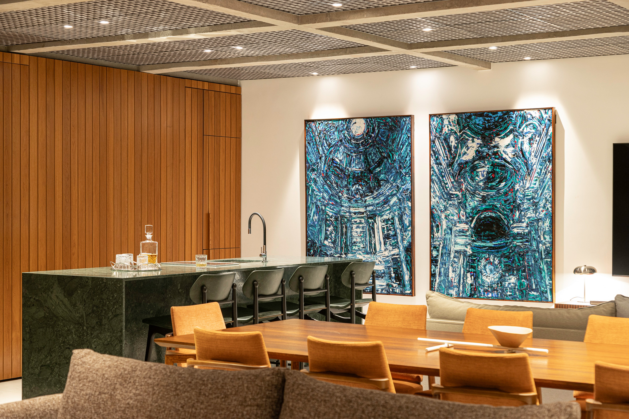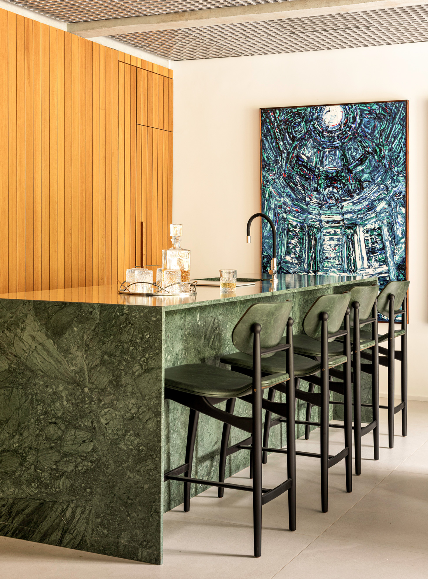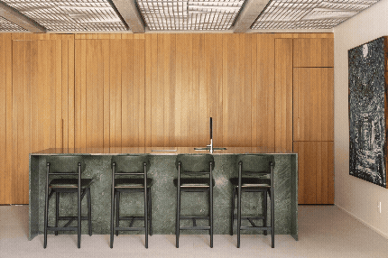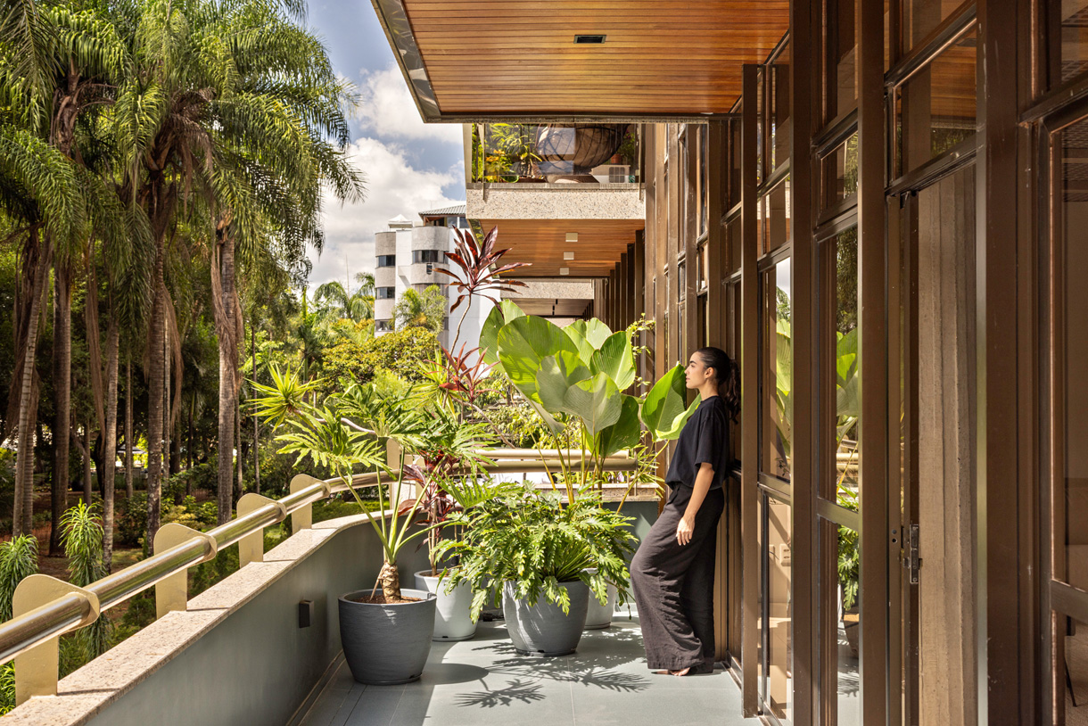 No pavimento inferior, a área social foi ampliada e reorganizada para atender ao desejo dos moradores de integrar a cozinha à sala, sem abrir mão de uma segunda cozinha – mais reservada para o dia a dia. O painel de madeira que percorre a sala e o forro colmeia criam eixos visuais marcantes e contribuem para a funcionalidade do espaço, permitindo amplos espaços de armazenagem e fácil acesso às instalações do piso superior, respectivamente. A bancada em mármore verde Guatemala se destaca como ponto de cor, complementado pelo paisagismo nas varandas. Elas reforçam a integração entre interior e exterior, trazendo o cinturão verde característico das superquadras para dentro do apartamento.