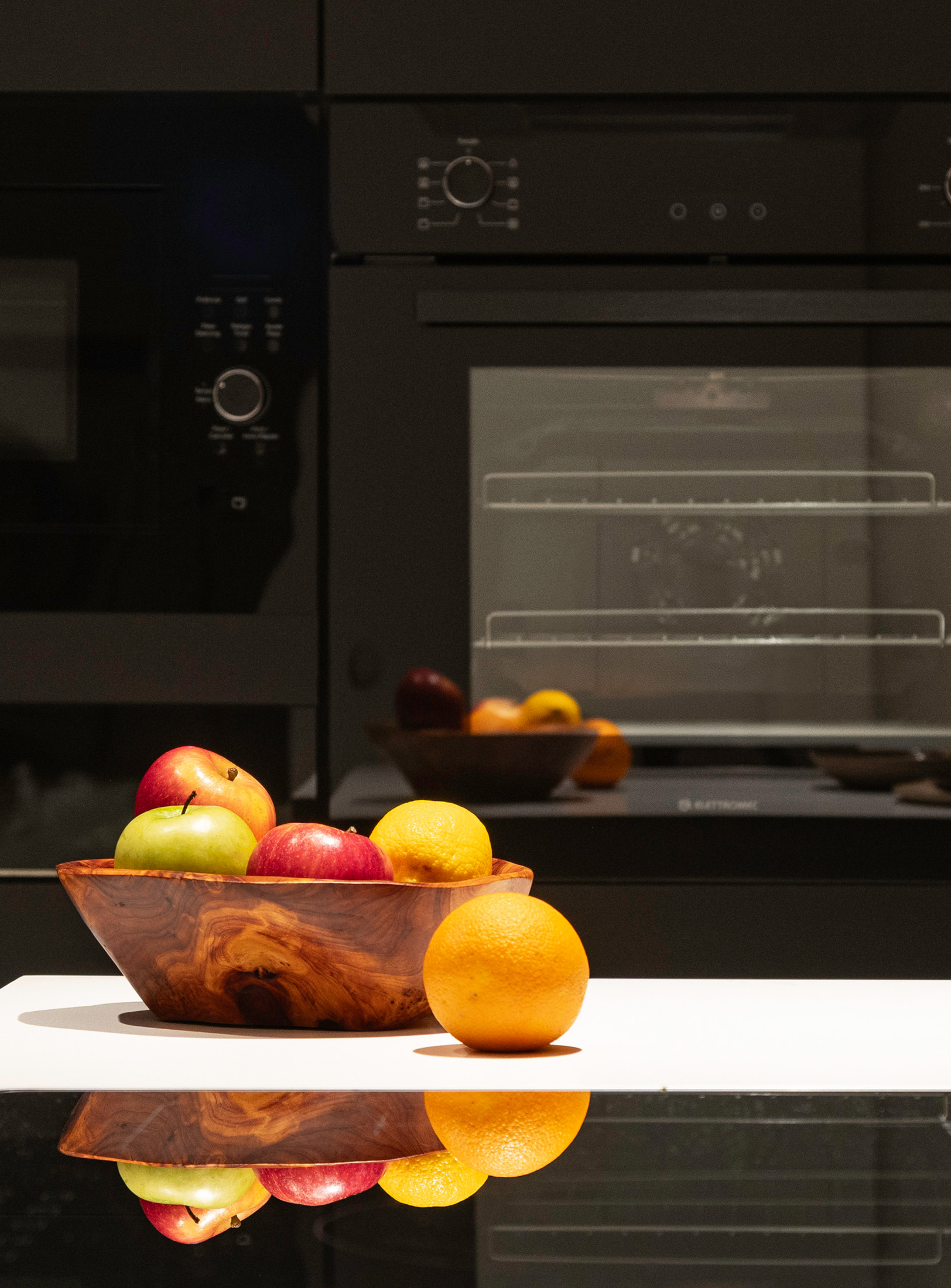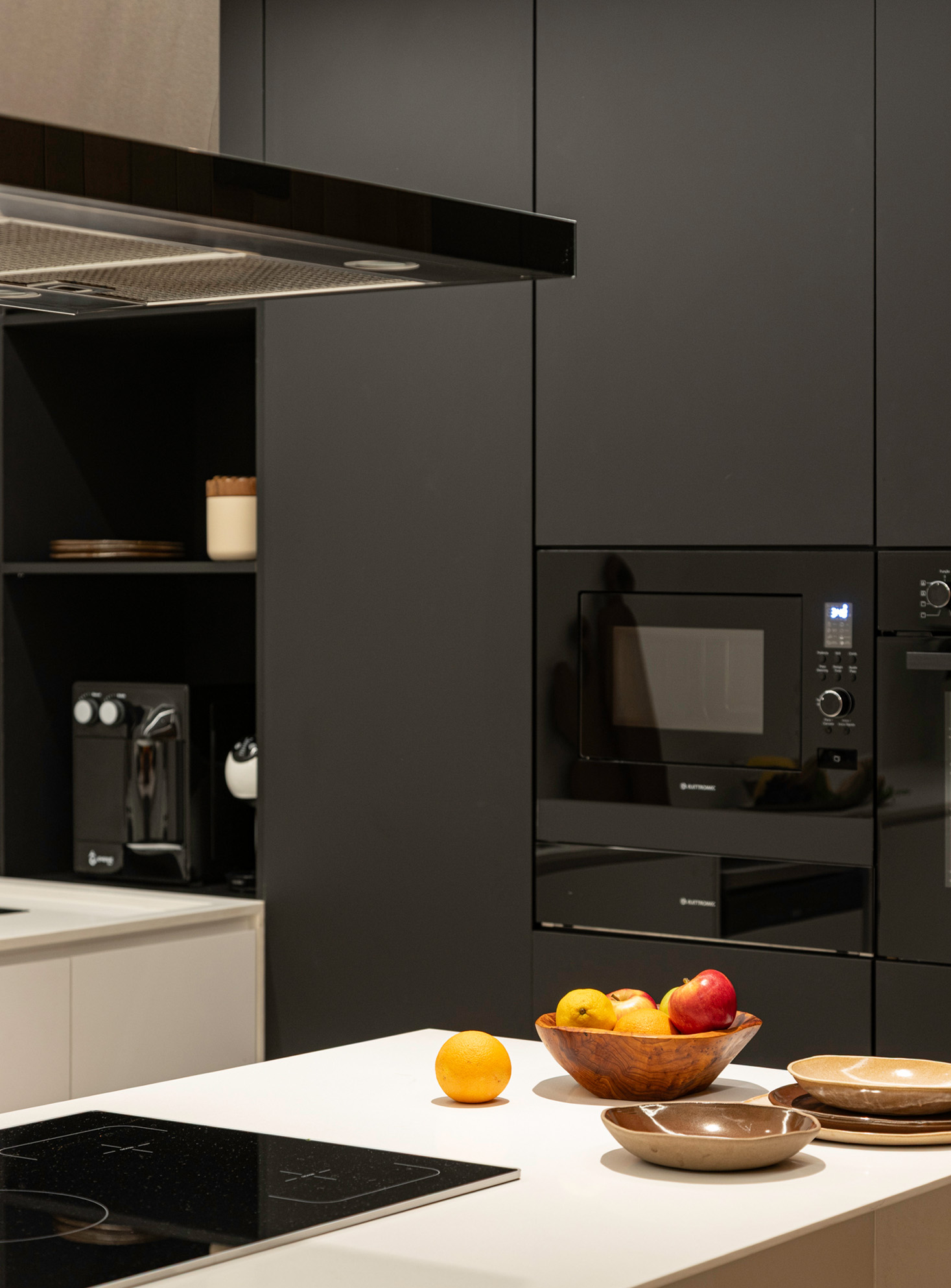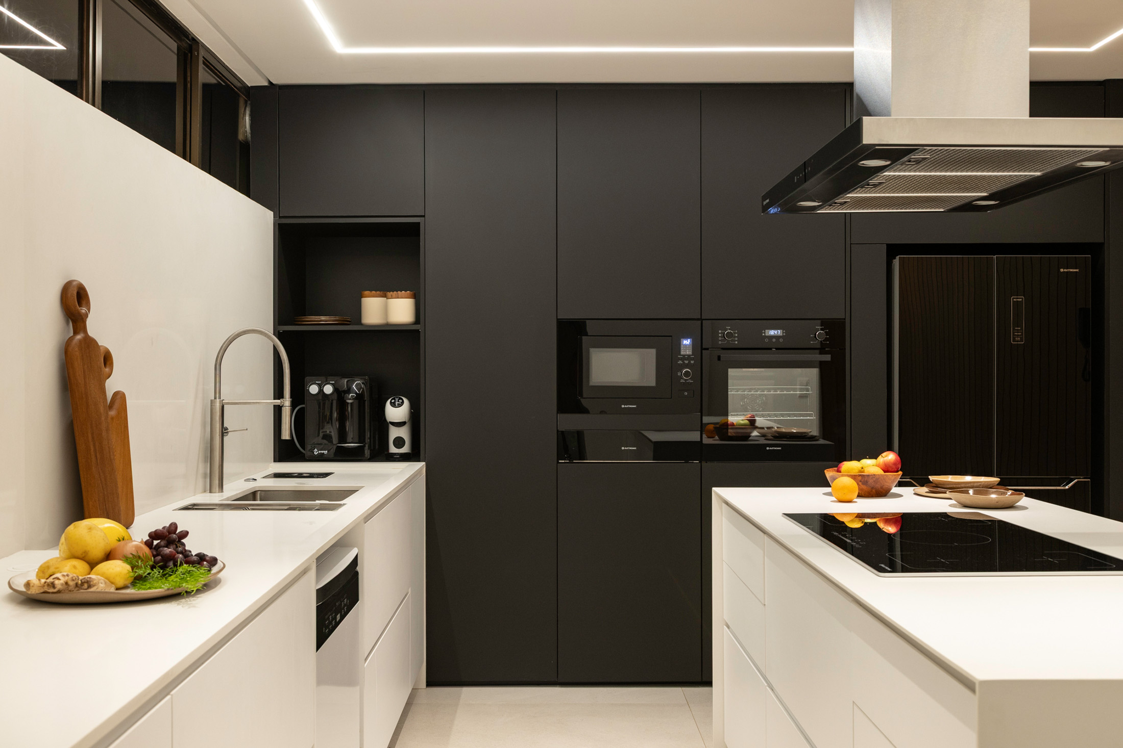 No pavimento inferior, a área social foi ampliada e reorganizada para atender ao desejo dos moradores de integrar a cozinha à sala, sem abrir mão de uma segunda cozinha – mais reservada para o dia a dia. O painel de madeira que percorre a sala e o forro colmeia criam eixos visuais marcantes e contribuem para a funcionalidade do espaço, permitindo amplos espaços de armazenagem e fácil acesso às instalações do piso superior, respectivamente. A bancada em mármore verde Guatemala se destaca como ponto de cor, complementado pelo paisagismo nas varandas. Elas reforçam a integração entre interior e exterior, trazendo o cinturão verde característico das superquadras para dentro do apartamento.