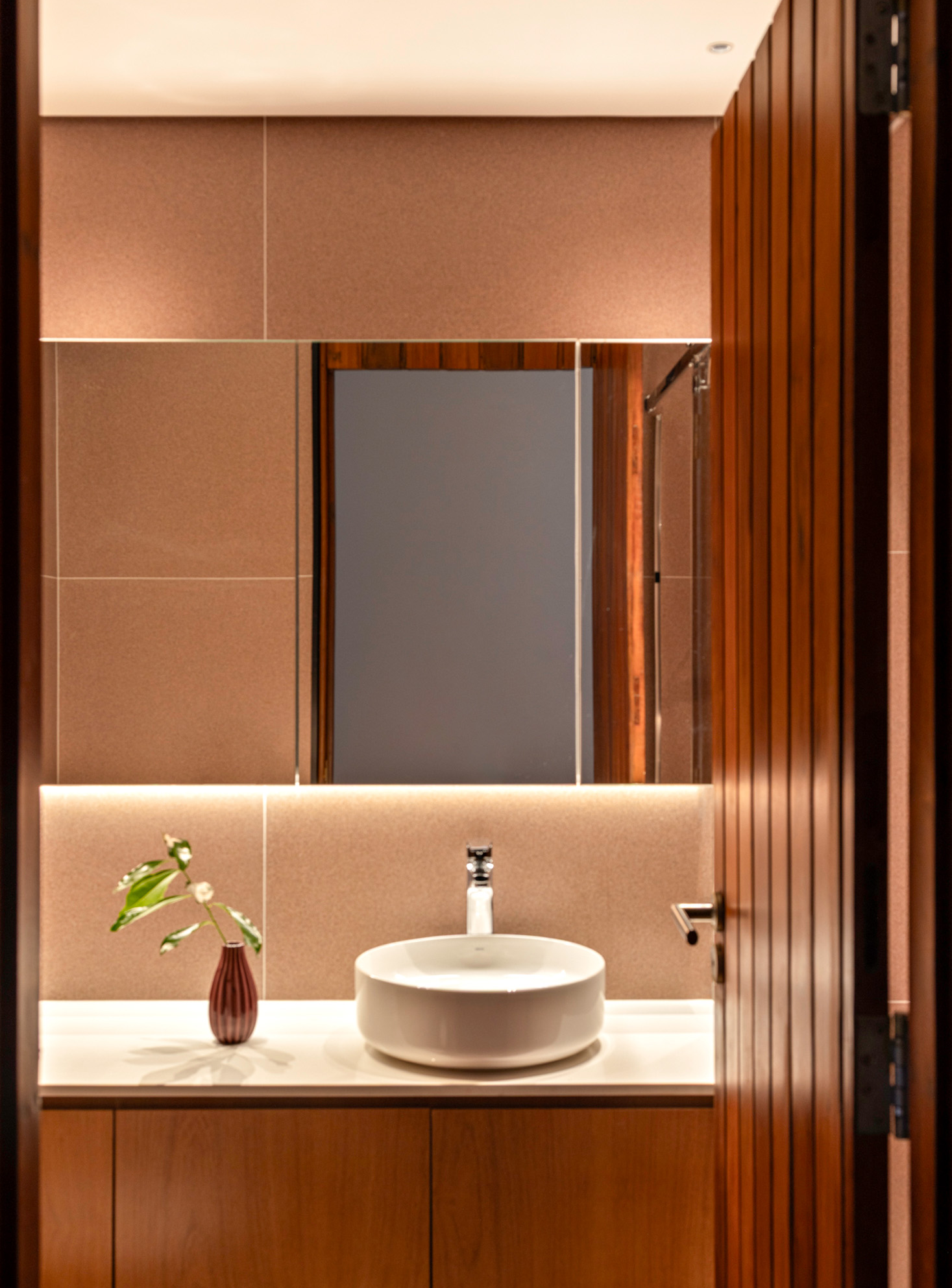 No pavimento superior, a nova configuração contempla três suítes, um banheiro social, uma sala de televisão e um escritório, todos conectados pelo piso em madeira cumaru, que traz aconchego e continuidade visual. Cada banheiro recebeu uma cor distinta do mesmo porcelanato, criando uma identidade própria para cada ambiente em harmonia com o todo. O resultado é um apartamento que alia estética e funcionalidade, onde texturas, cores neutras e iluminação personalizada se unem para expressar a essência dos moradores e o compromisso do escritório em criar espaços elegantes, integrados e atemporais.