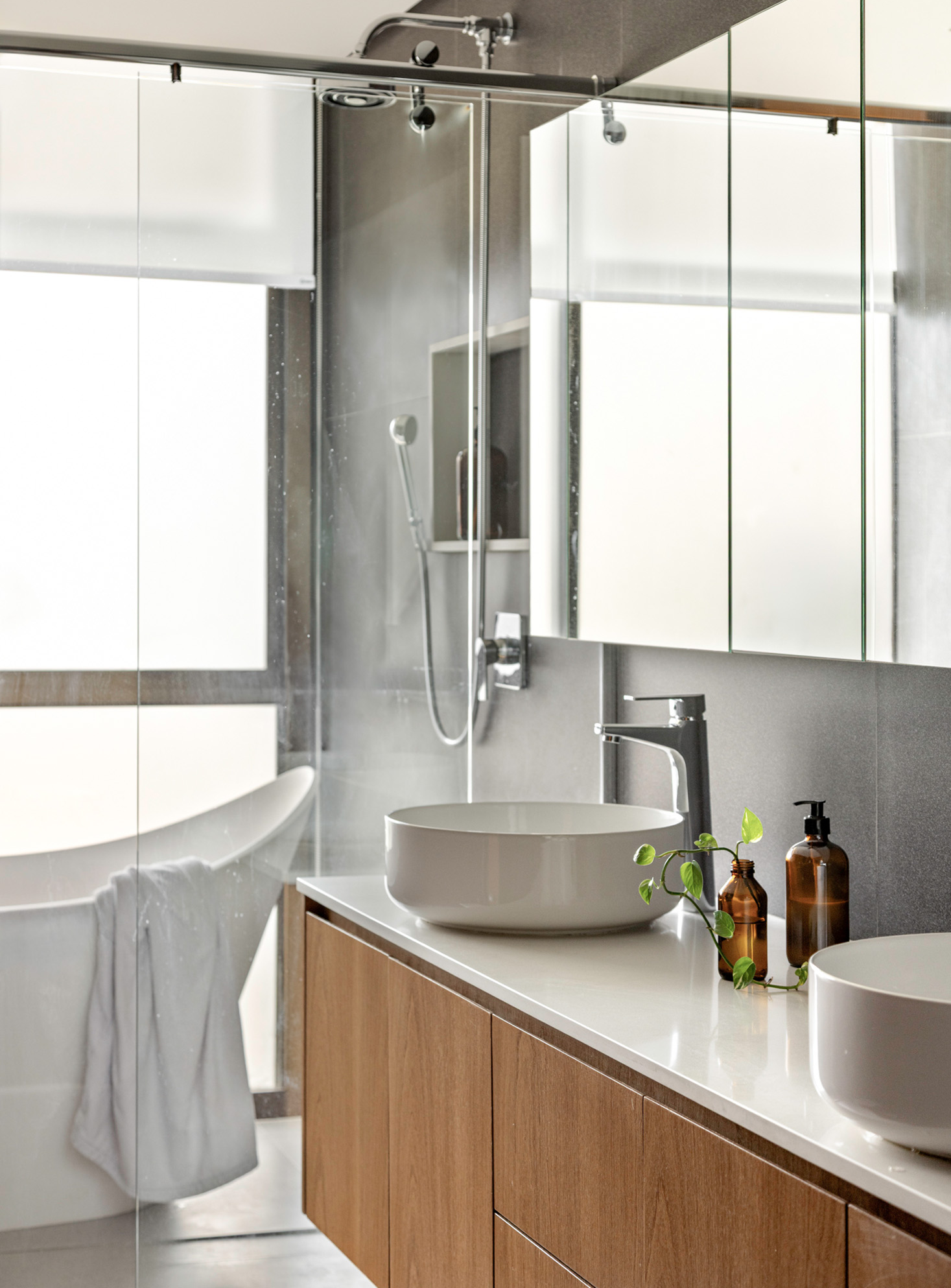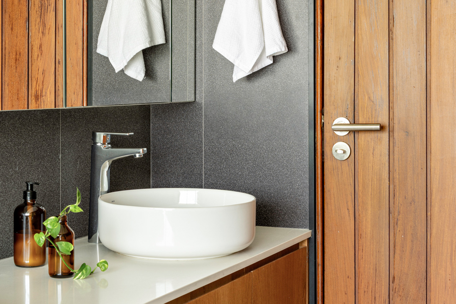 Cada banheiro recebeu uma cor distinta do mesmo porcelanato, criando uma identidade própria para cada ambiente em harmonia com o todo. Assim, mesmo com elementos semelhantes há uma melhor distinção dos espaços.
