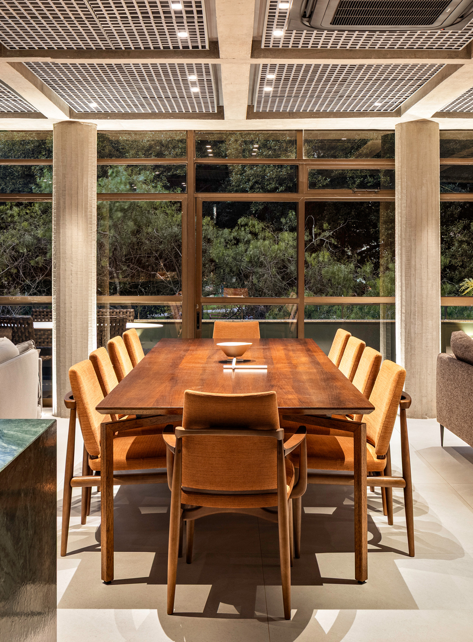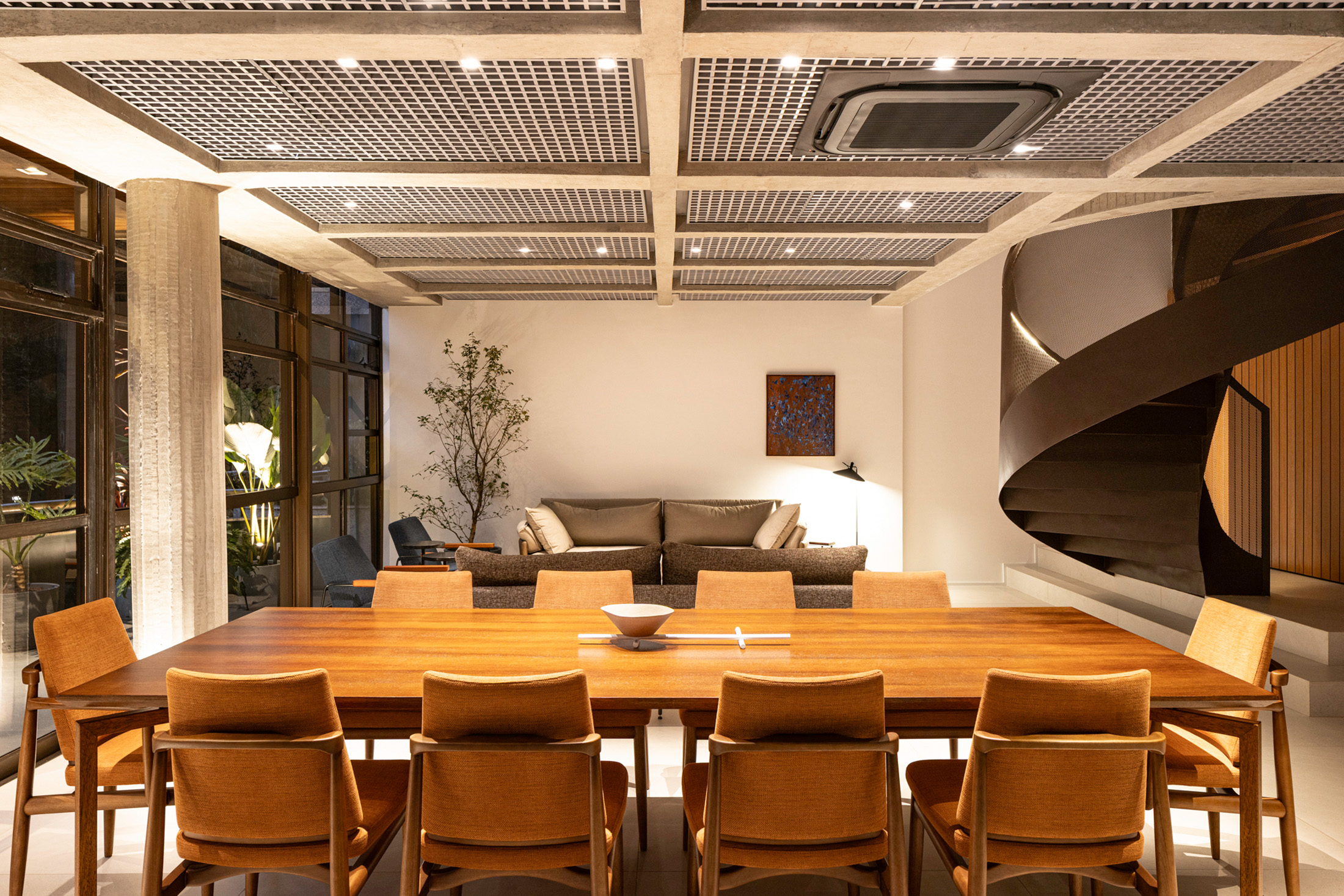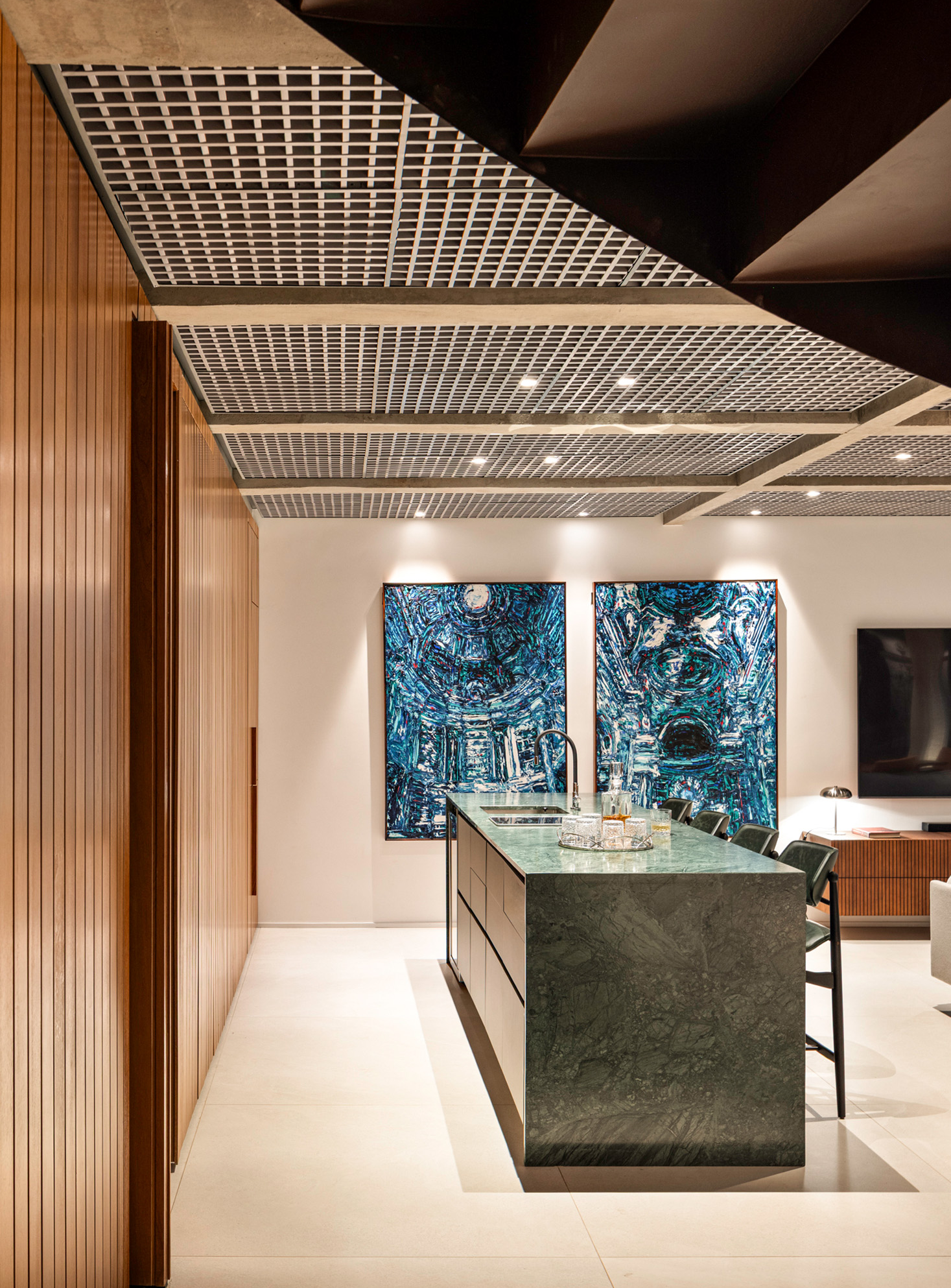 O forro colmeia cumpre estética e função – por se tratar de um apartamento duplex, manutenções futuras podem fazer necessária a intervenção pela laje. O forro faz com que as instalações do primeiro pavimento e do mezanino sejam facilmente acessadas por baixo, pela remoção e recolocação de um módulo da grelha.